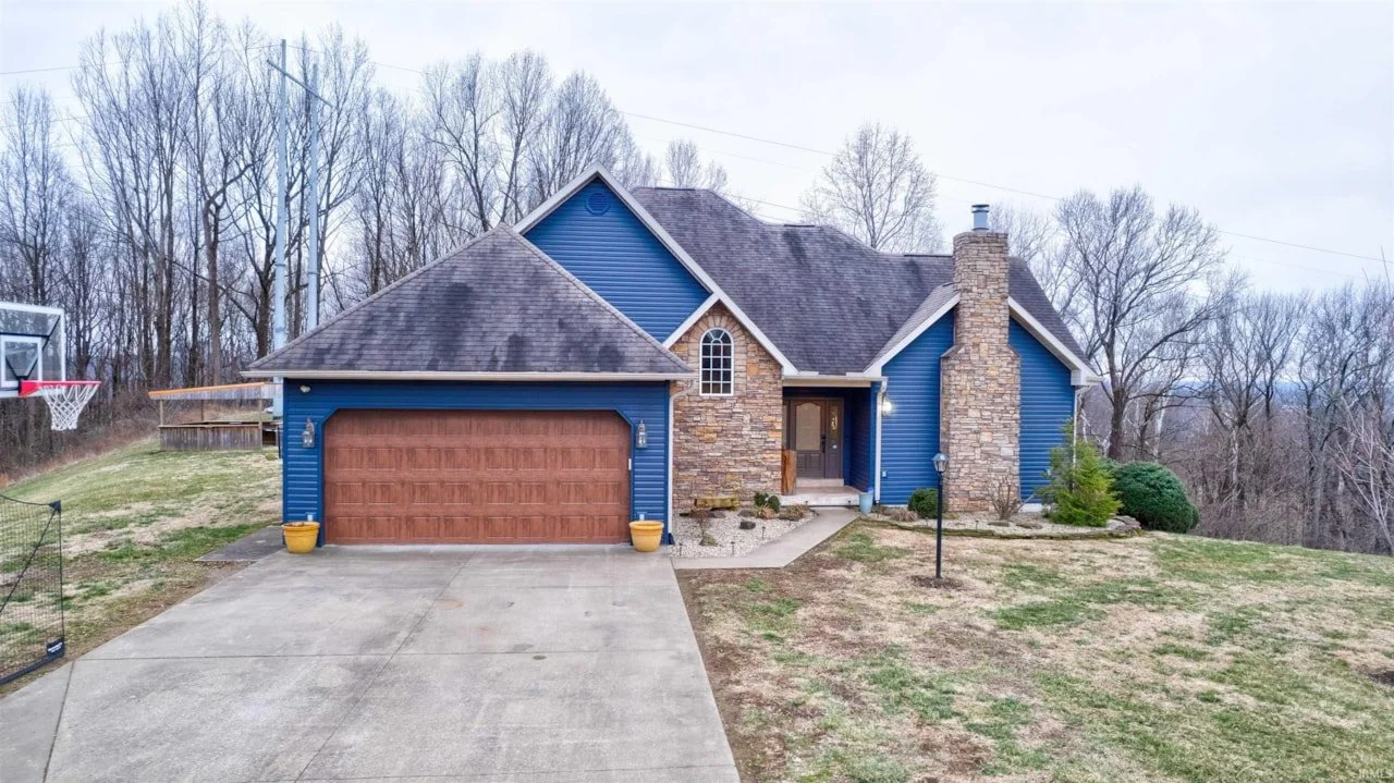 Perched on a hill at the end of a quiet dead-end street near Tell City, this custom-built two-story home on 10 acres offers 3 bedrooms, 2.5 baths, over 4,000 square feet of living space, and panoramic views of the Ohio River and surrounding countryside. The home features a dramatic 17-foot cathedral ceiling, expansive windows, a finished walk-out basement with fireplace, and a well-appointed kitchen with quartz countertops and walk-in pantry. Outdoor amenities include a large deck with pergola, gas fire pit, heated 16' x 32' in-ground pool, and a 24' x 40' barn, combining privacy, luxury, and acreage in a rare hilltop setting.